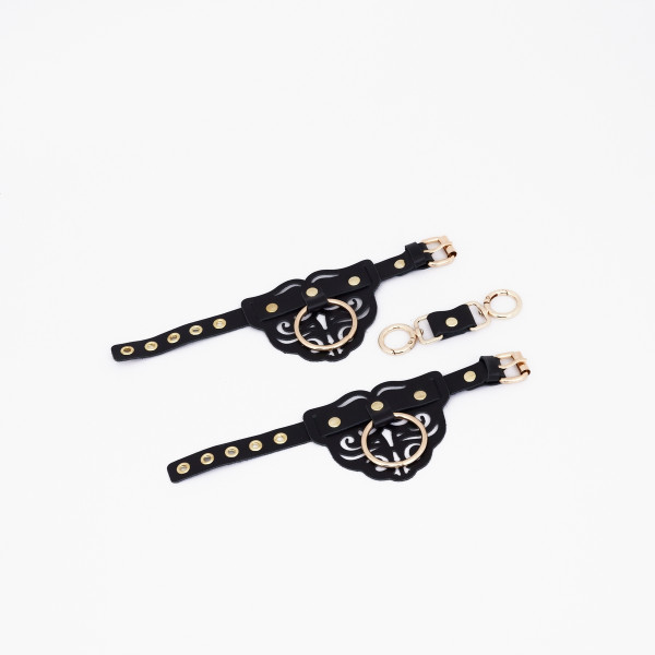 Выполнены наручники из натуральной кожи в лаконичном черном цвете. Фигурные вырезы на манжетах придают образу особенный шарм и подчеркивают нежность женских запястий. Золотая фурнитура придает образу особенную пикантность и подчеркивает отличный вкус владельца!