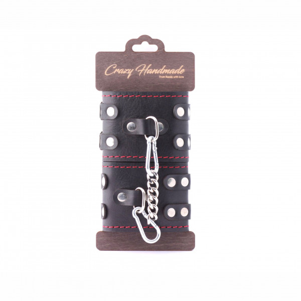 Каждый манжет имеет D-образное металлическое кольцо, к которым крепится при помощи карабинов металлическая цепь